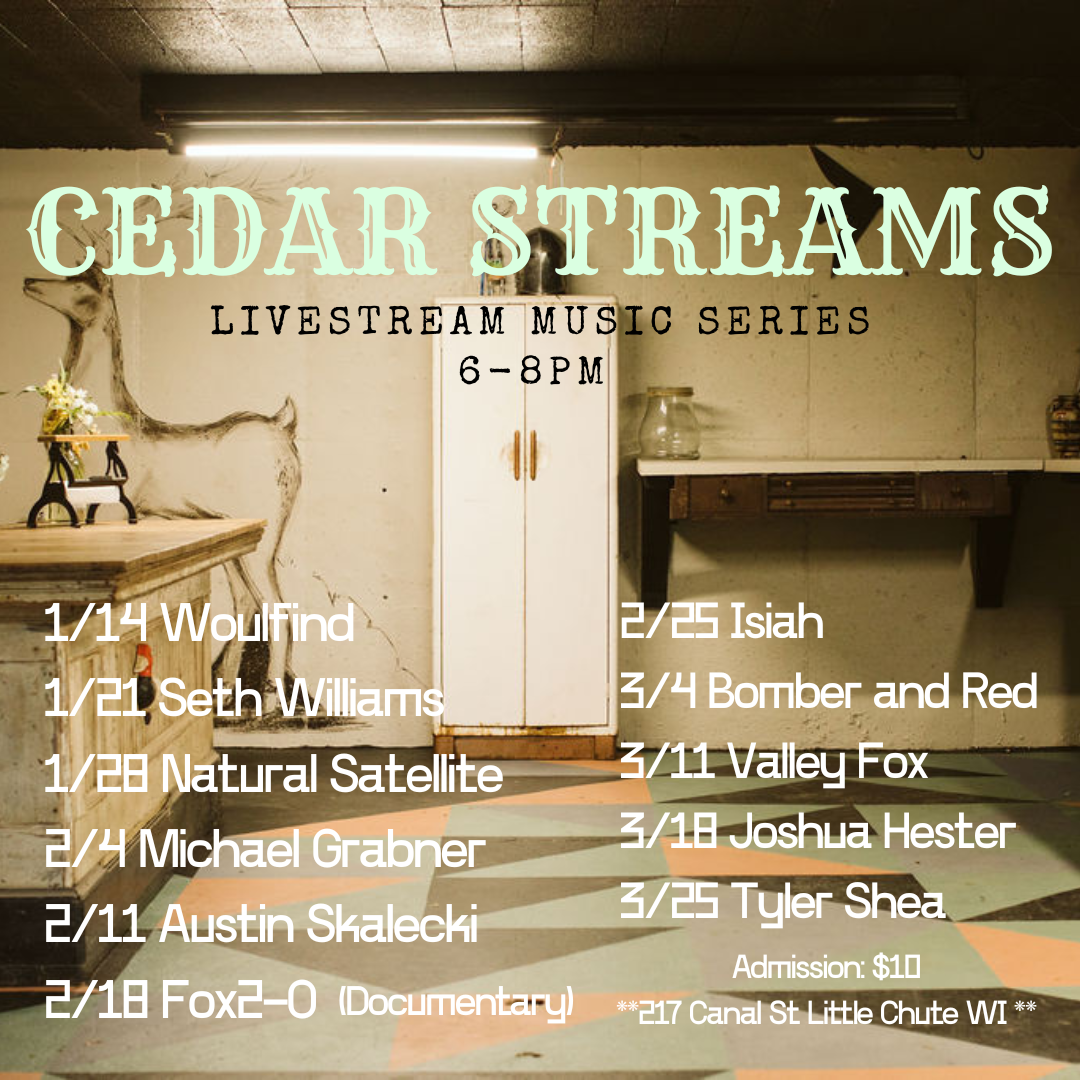 Cedar Streams is an in-person livestream series that takes place every Wednesday between 1/14/2026 and 4/1/2026 at The Cedars Project. Each week features a live performance/interview of an original artists in an intimate setting that will be streamed on Facebook and later uploaded to YouTube. Show start at 7pm. Guests should arrive at least 30 minutes before the show. Admission is $10. Seating is limited. No late entry.